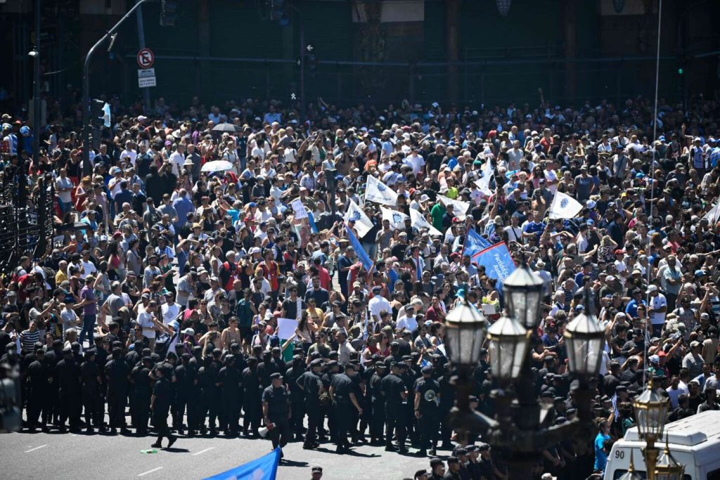 امتلأت ساحة البرلمان الضخمة في بوينس آيرس على مدار ساعات بآلاف المتظاهرين، بدعوة من الاتحاد العام للعمل في جمهورية الأرجنتين (CGT، الذي يدعي أن عدد أعضائه 7 ملايين عضو)، المركزي المؤيد (القريب من الحكومة السابقة)، الذي وانضمت إليها نقابات أخرى وحركات يسارية راديكالية ومنظمات اجتماعية.